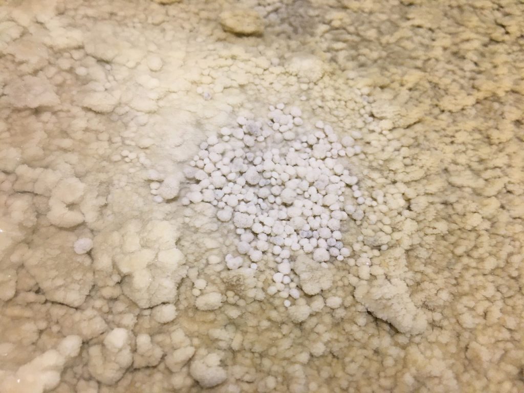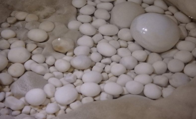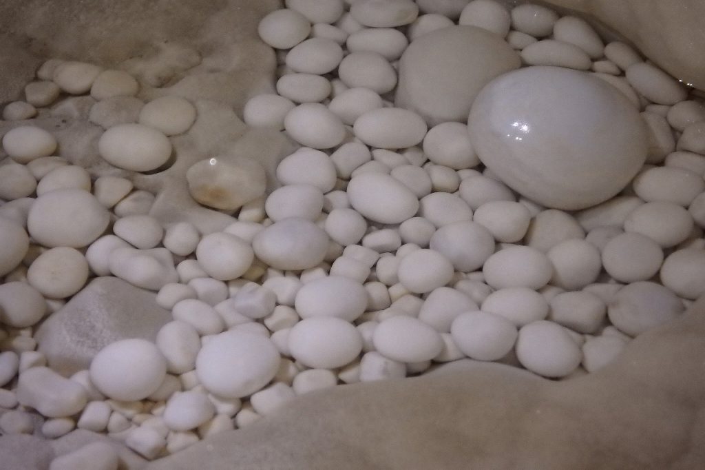 玉泉洞地下川的河床上也有像土豆一样大小的洞窟豆石。半切的话很难确认核的素材,好像是石灰藻球的断面。