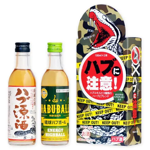 虽然不太为人所知,但是南都造酒所的毒蛇酒“注意HABU(龟壳花蛇)!”有这样的商品。“HABU(龟壳花蛇)源酒(100ml)”和“琉球蛇酒苏打特调用HABU(龟壳花蛇)源酒(100ml)”两套,是加入了原创HABU(龟壳花蛇)标签的迷彩保持退出的包装。