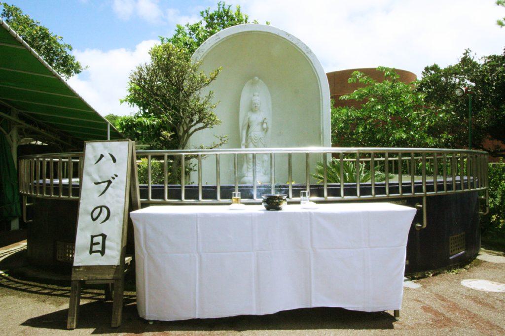 冲绳世界每年8月2日都会举行“HABU(龟壳花蛇)供养”活动。这天,公园内的“HABU博物公园”工作人员们向天蛇观音祈祷。