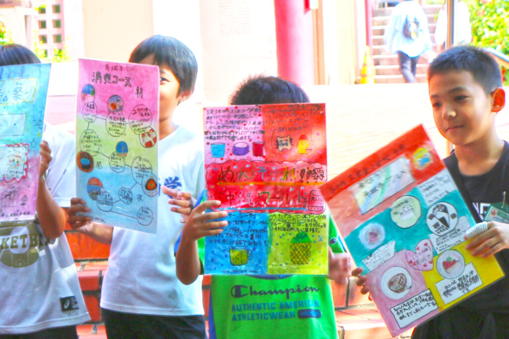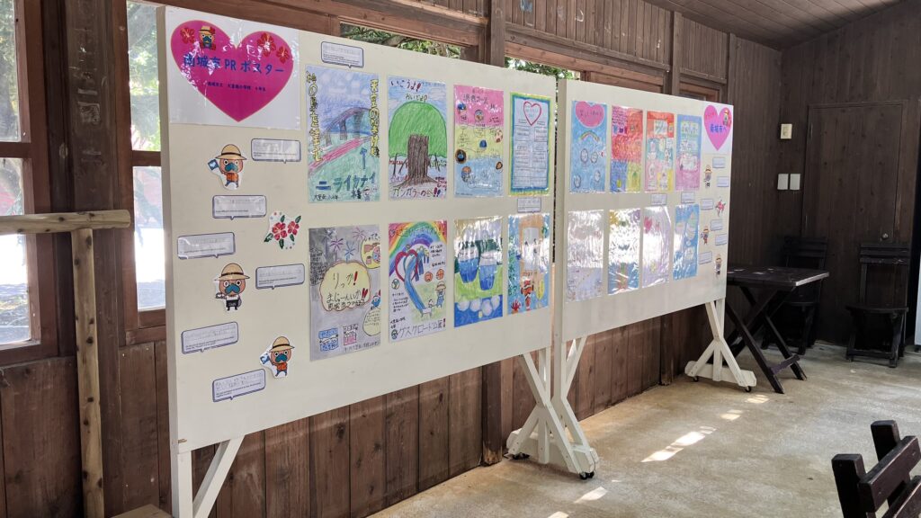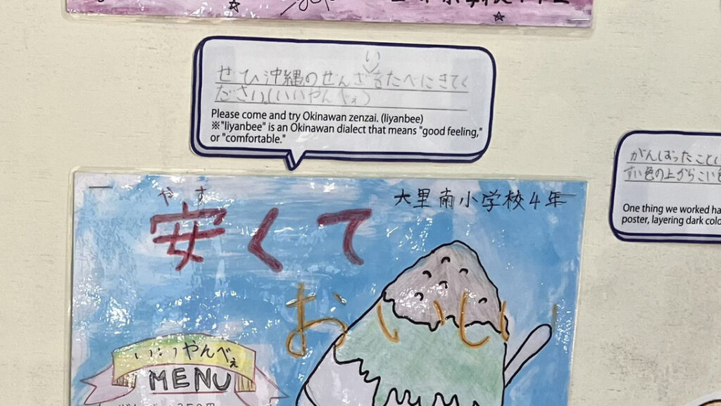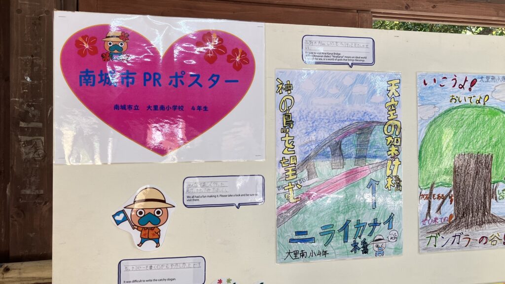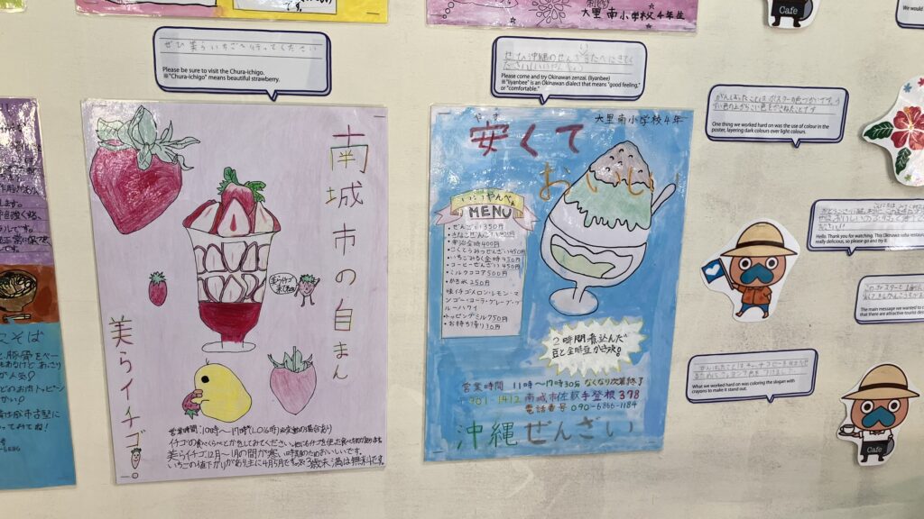 在冲绳世界内,当地啤酒咖啡馆旁边的休息场所,展示了当地南城市大里南小学4年级学生为了展示自己地区(南城市)的魅力而制作的海报(16张)。