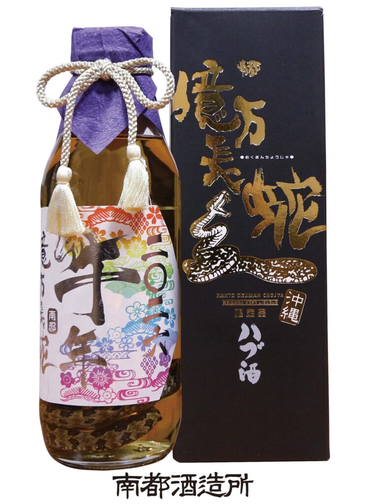 在南都造酒所的高级酒“HABU(龟壳花蛇)源酒35%”中,整个HABU(龟壳花蛇)腌制而成的冲击性超群的吉利酒。