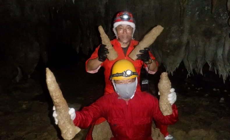 用折断的钟乳石拍纪念照![]()