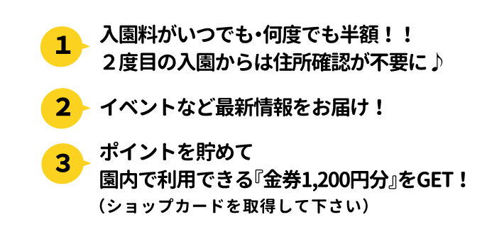 ※儿童票不属于积分对象。 ※关于商店卡的积分,在购买入园票时只会授予一台智能手机(账号)1天/1分。 (例:购买3名成人且2台智能手机的情况下,每2台给予1分。)